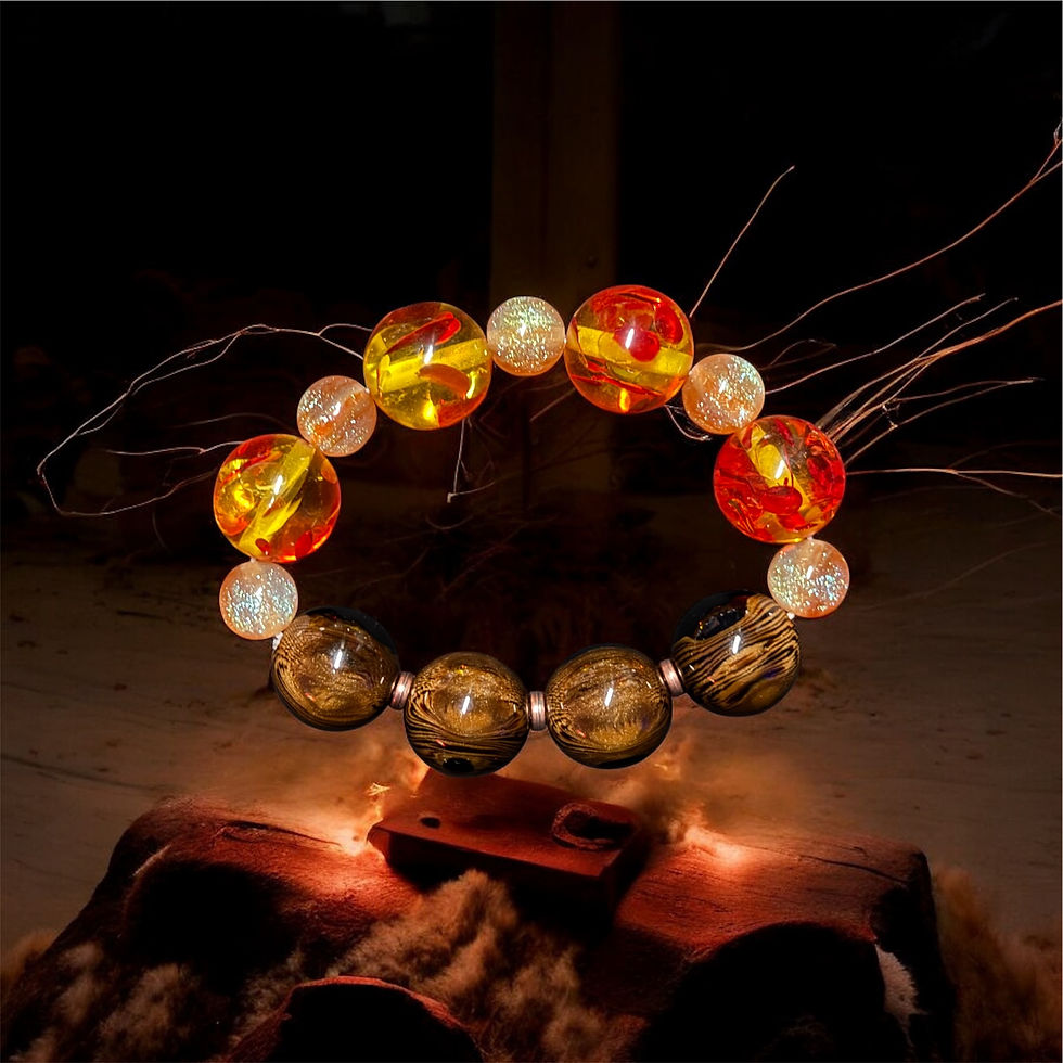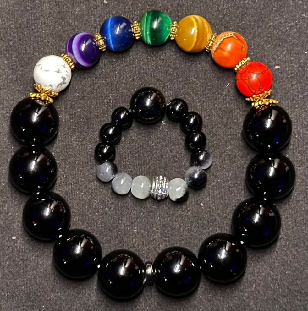 The Chakra Power Set is an innovative approach to helping one balance or realign their Chakra. Each piece contains six chambers (stones) atop with a ghost aura bead sitting in a slot...the whole band of the piece is that missing stone, so you've got a gathering of energy specifically for that chamber while maintaining contact with the other six. Pretty cool huh? LOL